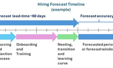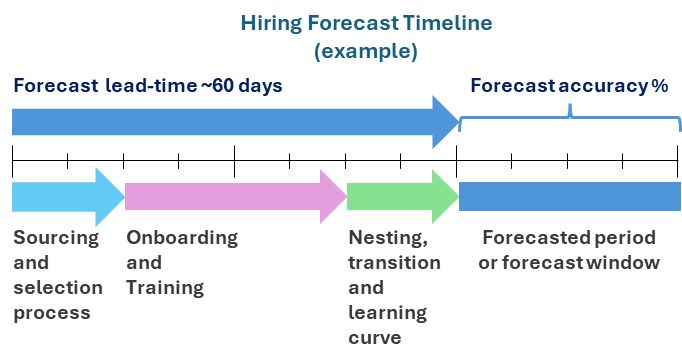 Among these, the hiring and staffing forecast is particularly important. It must be developed with enough lead time to accommodate the recruitment, training, and onboarding of new employees. This forecast must also account for the timeline of sourcing equipment, workspace, and approvals. That could mean creating a forecast 45 to 60 days ahead, while still expecting to achieve a +/- 5% accuracy.