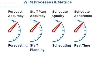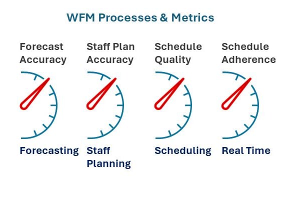 Although the impact of effective WFM is often measured by output metrics such as service level, efficiency, and cost, each core WFM process has specific indicators. These include Forecast Accuracy, Staff Plan Accuracy, Schedule Quality (or Efficiency), and Schedule Adherence, each linked to forecasting, capacity planning, scheduling, and real-time management.